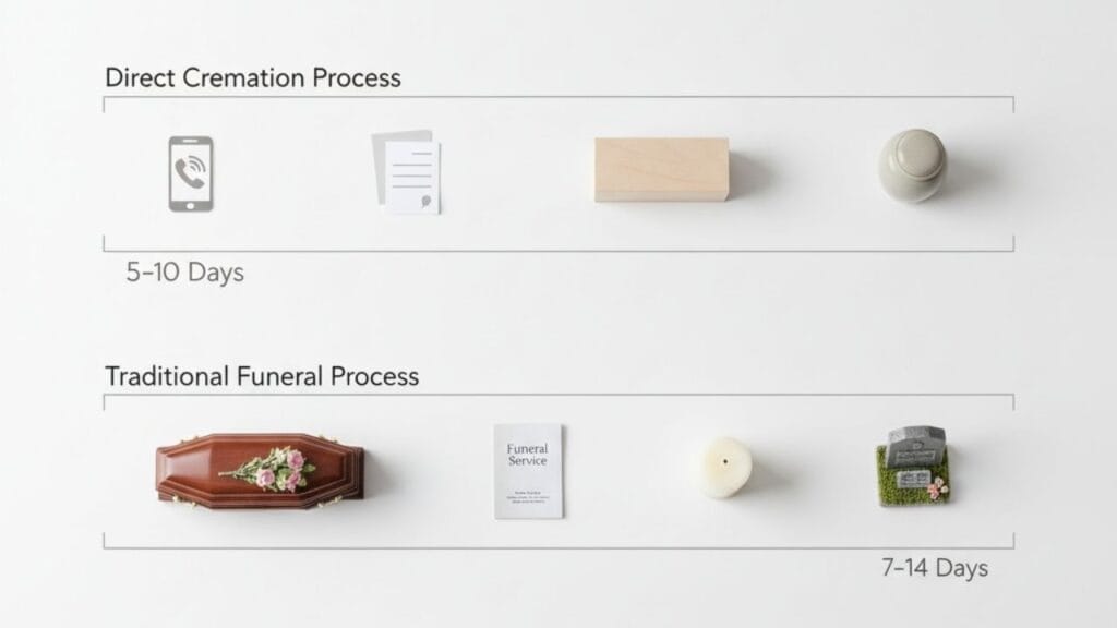The direct cremation timeline moves quickly and involves minimal family participation.