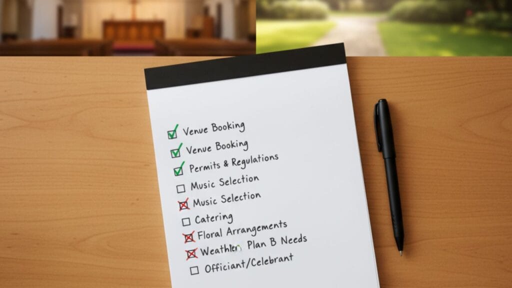 Outdoor services in public spaces almost always need permits. Start this process early. Delays can force last-minute changes.